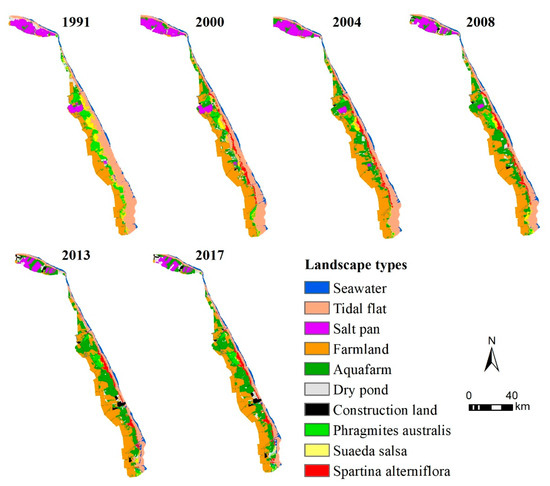 In this study, Landsat Thematic Mapper (TM) and Operational Land Imager (OLI) remote sensing image data were collected from the website of United States Geological Survey (USGS) (http://glovis.usgs.gov/) and the geographic spatial data cloud (reference). There were total 12 scenes of imagery selected from 6 years (1991, 2000, 2004, 2008, 2013 and 2017). Most images were acquired in spring, autumn and winter (from October to May). The basic parameters of the Landsat image data were summarized in Appendix A Table A1. After the multi-year image data were collected, the raw image data were processed with tailing, geometric correction and registration, band synthesis, image embedding and image enhancement. Finally, the processed images were visually interpreted by combining field investigation observations. Accuracies of different landscape types were proved to be higher than 85%. Combining with practical landscape distributions in the City of Yancheng and research needs, landscape types in the present study were divided into natural wetland landscapes and artificial wetland landscapes [39]. The former ones include seawater, tidal flat, Phragmites australis, Suaeda salsa, and Spartina alterniflora. The later ones cover salt pans, farmland, aquafarm, dry pond and construction land (Figure 2). In addition to making use of remote sensing image data, administration boundaries, road traffic, river water systems, planning of Jiangsu Province and the City of Yancheng, data of the natural reserve of Yancheng Coastal Wetland are also needed in landscape simulation for the future scenarios.