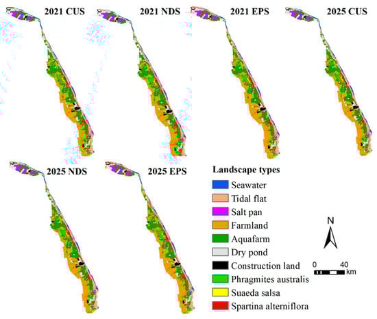 (1) CUS: with considerations of history of the study area and landscape changes under current conditions and under a qualified consistence test, constraints and prohibitive factors were chosen for landscape simulation. Hence, the resultant simulation continued and landscape simulation maps of the study area in 2021 and 2025 were gained by iterating the interval of 4 years. This simulation was closer to real landscape data of the study area and this was because it observed the current conditions and basic constraints. It could be called CUS simulation. Taking the transition matrices in 2013 and 2017 as the transition probability, and the 2017 suitability factors such as roads, rivers, towns and related prohibitive conditions as the transition rules, the landscape images of 2021 and 2025 in the current utilization scenario were obtained (Table A2). In this transition probability matrix, dry ponds and fish ponds in artificial wetlands had more conversions, and Phragmites australis, Suaeda salsa, and Spartina alterniflora in natural wetlands had higher conversion probabilities.