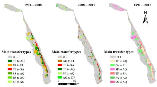 Spatial distribution of major conversion types. Note: OTT: other transfer types; TF: Tidal flat; AQ: aquafarm; PA: Phragmites australis; FL: farmland; SA: Spartina alterniflora; SS: Suaeda salsa; DP: dry pond; seawater: SW; SP: Salt pan.