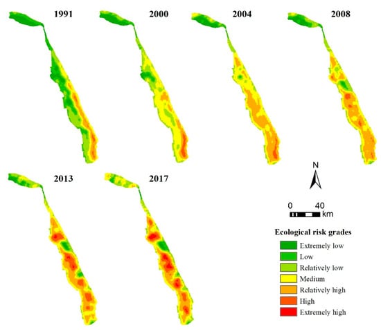 Ecological risks showed significant spatial distribution differences (Figure 8). Ecological risk was low in north part and high in south part in the study area at all 6 stages. Bordered at the center of Sheyang County, there were significant differences between south and north regions, which were expanding continuously. Ecological risks tended to increase. Ecological risk also presented great spatial differences across land-to-coastal transition. During 1991–2004, ecological risk presented a stripped growth from land to coastal regions and the ecological risk in land area was lower compared to that of coastal areas. During 2008–2017, ecological risks were high in middle and low in surrounding areas and ecological risks decreased gradually from central areas to land and coastal areas. Extremely low, low and relatively low ecological risk areas concentrated in the northern of Yancheng Coastal Wetland. Medium ecological risks concentrated in southern zone. High ecological risk zones, including relatively high, high and extremely high levels, mainly concentrated in the southern of Sheyang County. They were transferring from coastal regions to inland regions gradually.