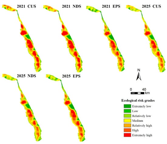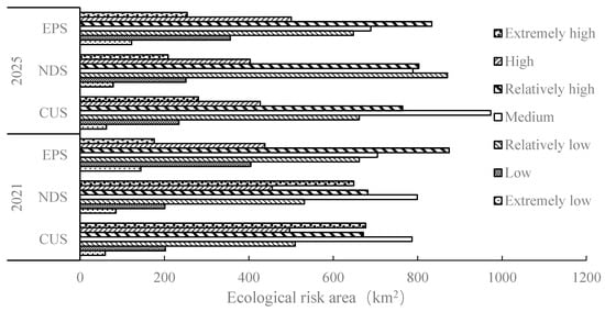 Landscape maps of Yancheng Coastal Wetland in future under different scenarios were gained through the landscape simulations. The spatial distribution maps of ecological risks under three scenarios during 2021–2025 were generated by interpolating ecological risk index and calculating statistics on ecological risk areas. On this basis, temporal and spatial change characteristics of ecological risks in future under the different scenarios were analyzed (Figure 9 and Figure 10).
