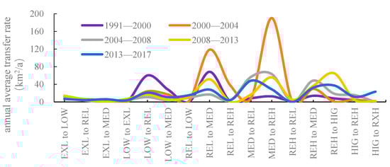 There were 35 transfer directions of ecological risks during 1991–2017. The total transfer area from a low ecological risk level to a high level could account for 2473.34 km2, which was 4.35 times that of the total transfer area from a high level to a low level (569.12 km2). This fully demonstrated the transfer complexity of ecological risks of Yancheng Coastal Wetland as well as the intensive impacts of rapid urbanization and industrialization on regional ecological risks. In the present study, a total of 16 landscape types with greater transfer areas were chosen for analysis (Figure 11). The annual transfer rates of five types, namely, EXL–LOW, LOW–REL, LOW–MED, REL–MED and REH–REL declined gradually. The transfer direction was mainly from low to high. The annual average rates of 11 transfer types, including EXL–REL, EXL–MED, LOW–EXL, REL–LOW, REL–REH, MED–REL, MED–REH, REH–MED, REH–HIG, HIG–REH, and HIG–EXH, increased gradually and the main transfer direction was from low to high. This demonstrated that regional ecological risk transferred from low to high and high ecological risk zone was expanded significantly. Among these transfer directions, two major peaks occurred in the REL–MED and MED–REH during 2000–2004, with a rate of 118.59 km2/year and 190.41 km2/year.