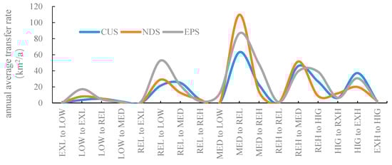 During 2017–2025, there were 24 transfer directions in statistics under the three scenarios, which decreased by 9 compared to that during 1991–2017. The ecological risk transfer was relieved. In this study, fifteen main transfer directions were chosen (Figure 12). Among them, the annual average rates of EXL–LOW, LOW–REL, LOW–MED, REL–MED, REL–REH, REH–MED, HIG–EXH, and EXH–HIG declined and the main transfer direction was from low to high. The annual average rates of LOW–EXL, REL–EXL, REL–LOW, MED–LOW, MED–REL, MED–REH, REH–REL, REH–HIG and HIG–REH increased and the main transfer direction was from high to low. Similar fluctuations are observed at different transfer directions under the three scenarios, with a general consistence between peaks and valleys. There are five obvious peak points, which are LOW–REL, REL–LOW, MED–REL, REH–MED, and HIG–EXH. Under NDS, the maximum peak zone is in the medium-relatively low zones and the annual average transfer rate is 109.89 km2/year. Peak values are mainly transferred from high to low ecological risks. This reflect that under the simulation scenarios, ecological risks of Yancheng Coastal Wetland are controlled and decreased effectively by implementation of ecological protection policies as well as reasonable development and use of landscapes. This also suggests to strengthen ecological restoration and protection of wetland in future, implement current ecological protection policies, formulate new planning policies according to new environment in future, and promote high-efficiency and reasonable use and protection of coastal wetlands.