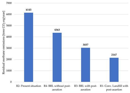 The waste sampled from reactor R1 produced a lower quantity of residual methane than reactor R3, showing a higher impact of aeration operation on waste stabilization in the presence of limited water than in the presence of high moisture content. However, waste sampled form reactor R3 (bioreactor (BRL) with post-aeration) shows a higher residual methane reduction than R4 (BRL without post-care). The lower residual methane emissions from R3 were the result of increased decomposition of organic matter due to the post-aeration phase observed in the reactor.