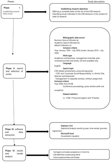 The research information was collected from publications from January 1950 to July 2020, and books from January 2010 to July 2020. The initial numbers for descriptors “CSR” and “corporate social responsibility” were: (a) = 13,023, (b) = 5663, (c) = 167. Only works in English were considered, as this language is the most widely used in scientific publications [41]. The second step was to narrow down the papers to ones with “corporate social responsibility or csr” in the title (section TI: results 5048 (a) and 1259 (b), accordingly), 67 (c). Further, selection articles with ”corporate social responsibility or csr” in the abstract or keywords (sections AB and KW: 4623 (a) and 1080 (b)). The next stage was to recognize management-oriented papers only (window: “management”, without assignment: 2519 (a) and 381 (b), 31 (c)). The last part of selection was performed through carefully reading each of the works and excluding those related to the public sector and NPOs and (or) also based on the rule of ceteris paribus: the author’s intension was to avoid unilateral (strictly positive or negative), biased approaches to CSR [42,43]. One hundred nineteen journals and 19 books satisfied the criteria.