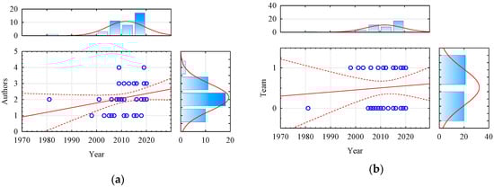 Referring to the number of authors per paper, the conducted research indicated a moderate strong correlation with the number of domestic authors (Figure 2a) and a very weak correlation in the context of international teams to domestic and individual ones (Figure 2b).