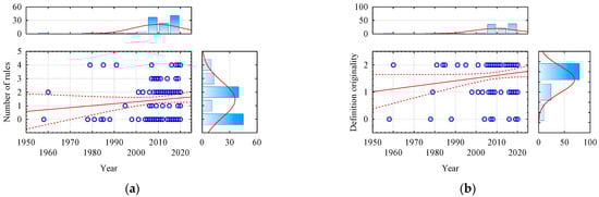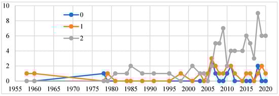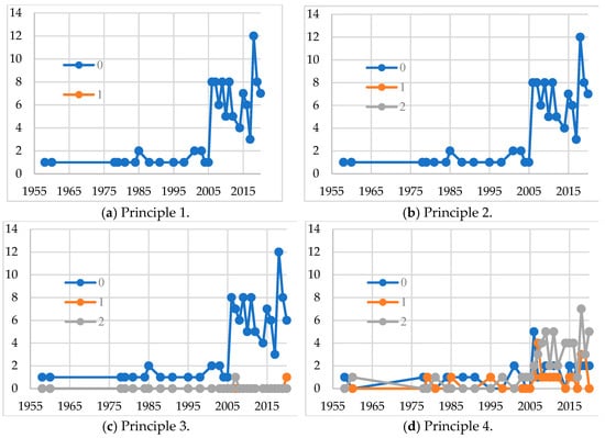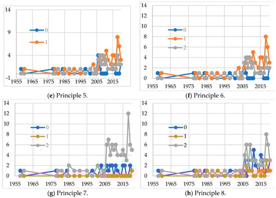 The scholars (Appendix A) in over 75% of papers implement (directly or axiomatically) the CSR definitions of their predecessors, ones which sanction and support their research aims, which confirms the conclusions of Devinney et al. [47] and Sheehy [22]. Only 2.9% of the abovementioned definitions are based, according to the claims of the authors, on Carnegie’s concept. Hence, the answer to RQ1 is negative. To address RQ2, an analysis of the eight Carnegie principles cited above was implemented, referring to the publication year and the number of papers. There were three possible outcomes: 0—principle nonexistence, 1—principle existence, 2—inability to specify (according to the content) (Appendix A) (Figure 5a–h).