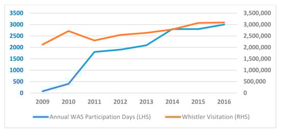 To redress the research gaps, we conducted a longitudinal prospective case study of Whistler Adaptive Sports (WAS) analyzed via a novel temporal extension of the SEF (TESEF) [13] to examine an example of how WAS leveraged a MSE for a parasport participation and tourism legacy. The case was examined before, during, and for nearly a decade after the Vancouver 2010 Olympic and Paralympic Winter Games (Vancouver2010). This research occurred over a period when Whistler’s modest tourism growth was outpaced by WAS’s phenomenal participation day growth (Figure 1). The enabling factors that facilitated and sustained WAS’s legacy from Vancouver2010 are investigated and deconstructed below.