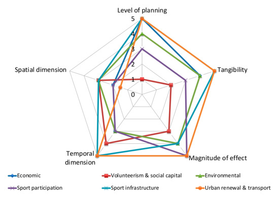 Legacies are what remains after the MSE and are event-centered, while leveraging relates to the strategic planning and activities to achieve beneficial MSE outcomes [24,25]. The panoply of MSE legacies include infrastructure (stadia, roads, and transport); volunteering and sport participation growth; and enhanced destination competitiveness [7,19,26,27]. As explored in Figure 2 the level of planning, scale, cost, and temporal and spatial dimensions of legacies may vary, as does whether it is considered positive or negative [27]. Crucially, for legacy research and practice, the legacy radar or web [27] expands previous legacy frameworks by adding the spatial and temporal dimensions [27,28]. The sport participation outcome explored here would be considered to be planned, tangible, large scale for WAS, but small scale for a NSO, ongoing temporally, while spatially it could be international given the tourism aspect. Overall, it is a positive legacy.
