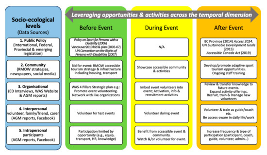 To complement MSE legacy and leverage frameworks, sport intervention studies, disability studies’ social model, and the leisure constraints framework, this study applies an extension to the socioecological framework (SEF) that explored the multilevel influences upon behavior, thus leveraging human development and behavior research [15,17,47]. Bronfenbrenner’s latter ecological framework [17] referred to micro, meso, exo, macro, and chrono levels, while in health, the levels were labeled as follows: public policy; community; organizational; interpersonal and intrapersonal [16,47].