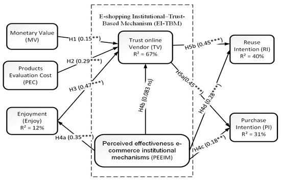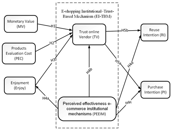 The distinction between trust-specific beliefs and trust as a general belief has been studied primarily in the context of interpersonal relationships within an organization [10,20]. However, with ongoing economic transformations in the e-shopping environment, this distinction is seldom maintained, especially in e-commerce research. Accordingly, this study extends the empirical [10] study and investigation the study based on a combination of two institutional mechanisms (perceived effectiveness e-commerce institutional mechanisms (PEEIM) and trust-based mechanism) to be appropriate for the present customer purchase behavior in e-shopping environments. Two of these institutional mechanisms (customer trust online vendor and PEEIM), we conceptualize as e-shopping institutional–trust-based mechanism (EI-TBM). EI-TBM implements trust from general and specific perspectives as an advanced institutional mechanism to mitigate risks through independent and interdependent relationships.
