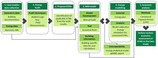 A BIM-based methodology for energy retrofitting educational buildings is adopted [30]. The methodology consists of six prime steps, as seen in the methodology flowchart of the study (Figure 1). The steps include: (1) Case study data collection, (2) energy auditing, (3) proposing ECMs, (4) BIM model development, (5) energy assessment of proposed ECMs, and (6) economic assessment of proposed ECMs. At first, all the data regarding the case study are collected including building construction documentation. Next, an energy Audit is conducted to determine the ECMs. Then, a BIM model of the case study is developed based on the data collected. The BIM model is used for the next two steps. For the energy analysis step, the model is exported as Green Building XML (gbXML) format and simulated in an energy simulation software for the analysis. For the economic assessment step, building specific data including Bill of Quantities (BOQ) of the case study are exported from the BIM model. In the end, the proposed ECMs are individually assessed, and a holistic energy-retrofitting scenario comprising all ECMs, for the selected educational building case study, is presented.