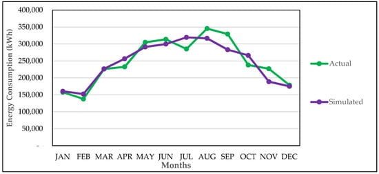 Calibration of the energy model was conducted by comparing the simulated energy modelling results of the base case with actual energy consumption data of 2016. The validation results indicate a difference in the annual energy consumption between the energy model and the actual case study is just 1.10% (Figure 3). Thus, the developed energy model was calibrated with the actual conditions of the building.