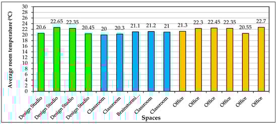 Measurements relating to assessment of the thermal comfort were conducted in the 15 spaces (four design studios, five classrooms, and six offices). The measurements were conducted in multiple spaces of the same type to develop a representative baseline measurement for each of the space. Firstly, regarding the room temperature, the field measurements revealed that most of the spaces investigated had a cooler air temperature than recommended by ASHRAE standards (ASHRAE 55-2013: Thermal Environmental Conditions for Human Occupancy). The standard states that the comfortable temperature range is between 22 °C and 26 °C [34]. Figure 4 illustrates the measured air temperatures of the 15 spaces, and it can be seen that majority of the spaces’ temperature is below the recommended comfortable temperature range. In addition, variations in the measurement are observed in the same type of spaces. Since occupants cannot control the temperature settings, the set-pint temperature is set at a constant 19 °C; however, the measurements are varied due to the location of a particular space in the building.