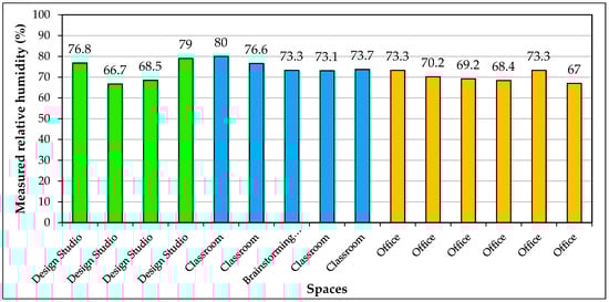 Similarly, the relative humidity was also recorded for the same spaces. As stated in ASHRAE 55-2013, the comfortable range of relative humidity is between 40% to 60% [34]. It was found that all of the measured spaces’ relative humidity is not in accordance with ASHRAE standards, and values are above the comfortable rate of 60%, as shown in Figure 5. Furthermore, similar to the temperature measurements, the relative humidity percentage is varying in the same type of spaces due to lack of control on the humidity settings and the location of the space in the building.