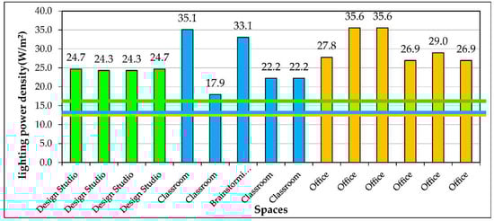 Computed lighting power densities (LPDs) for 15 spaces. The green line illustrates the maximum LPD for design studios, blue for classrooms, and orange for offices.