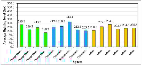 Values of average lighting level density for 15 spaces. The green line illustrates the minimum lux required for design studios, blue for classrooms, and orange for offices.