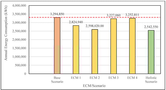 Annual energy consumption for the base case and after implementing each of the ECMs.