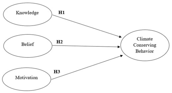 The actions to mitigate climate change known as climate conservation behaviors include opting for public transport, carpooling, conserving energy at home and recycling. The impact and intend-oriented climate conservation or mitigating behaviors predominantly centered on individuals [46]. The behaviors are largely habitual in which people behave according to past experiences [34]. Combination of various causal factors determines the habits driven private sphere pro-environmental behaviors. Past studies demonstrate that various antecedents inform climate conserving behaviors. The antecedents include belief [44,47,48], motivation [20,49,50] and knowledge [20,25,51,52,53]. Frequently, the causal factors are context-specific and locally relevant. Earlier studies on climate change education involving Malaysian students documented that secondary school students’ knowledge of climate change is instrumental for behavioral change for mitigating climate change [52]. Another study employed climate change education to explore students’ belief that changing their behavior decelerates the climate changes [54]. Motivation is another factor closely related to Malaysian students’ climate conserving behaviors [20]. In the studies mentioned above, the effects of belief, motivation and knowledge on climate conserving behavior have been investigated in isolation. However, VBN and TPB denote that the antecedents collectively inform behavior formation. The ultimate aim of this study is to establish a model that collectively explains the effects of knowledge, belief and motivation on the formation of climate conserving behaviors. Subsequently, the study bridges the gap in the lack of such a model in the literature to explain climate conserving behaviors.