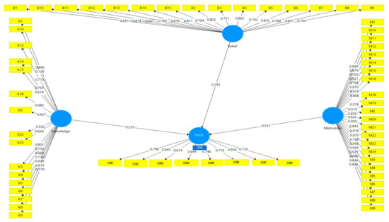 A PLS path model comprises of measurement and structural models formulated in testing the hypotheses. The measurement model exhibits the effects between the latent variables (construct) and the manifested variables (items). The structural model demonstrates the impact of the latent variables [95]. In this study, the manifest variables are knowledge (measured as K1 through K25), belief (measured as B1 through B15), motivation towards the environments (measured as M1 through M24) and climate conserving behavior (measured as CCB1 through CCB8). The four latent variables in this study are knowledge about climate change, belief, motivation and climate conserving behavior.