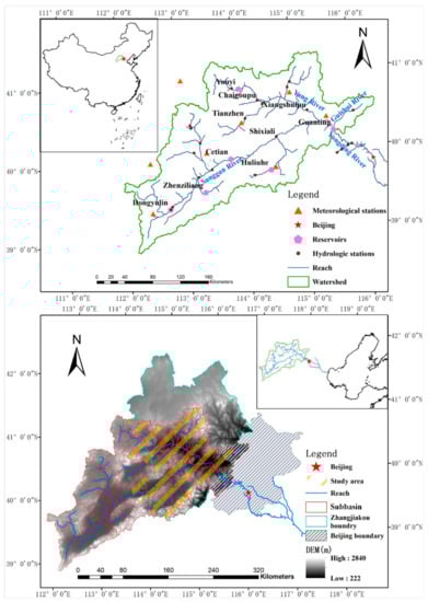 Location and Digital Elevation Model (DEM) of the Guanting Reservoir watershed. The overlapping area of the Zhangjiakou administrative area and the watershed is the study area. The specific scope is determined by the intersect operation of the sub-watershed and research area.