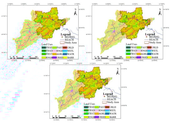 The distribution of land use types in Guanting Reservoir watershed of 2000, 2010, and 2015 (from top left to bottom right), where the red frame is the research area and the translucent part is the remaining area of the Guanting Reservoir watershed.