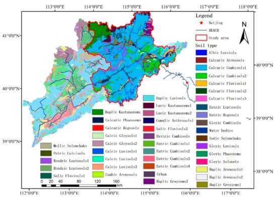 The distribution soil types in the Guanting Reservoir watershed in 2015, where the red frame is the research area and the translucent part is the remaining area of the Guanting Reservoir watershed.