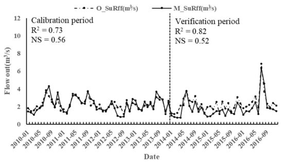 In this study, the SWAT model was calibrated and verified in monthly steps. The warm-up period was set from 2008 to 2009, the calibration period from 2010 to 2013, and the verification period from 2014 to 2016. To evaluate the error between simulated values and observed values introduced by the input data or the initial database of the model, the applicability of the model was verified by comparing graphs and statistical standards. The Nash efficiency coefficient (NSE) [35] and goodness of fit (R2) are commonly used indicators to evaluate the fitting effect of the model. The calculation method of the two indicators are as follows: