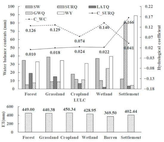 Grassland had the highest soil water content (38.85 mm), followed by wetland (37.06 mm) and forest (34.73 mm), while the farmland’s soil water content (18.05 mm) was only 46.47% of that of grassland. The evapotranspiration of different land uses is relatively close, but the evapotranspiration of farmland is the largest, and the evapotranspiration of settlements is the smallest. Compared with farmland, forests and grasslands have less evapotranspiration and surface runoff and more subsurface runoff and soil water content, indicating that both can retain more precipitation.