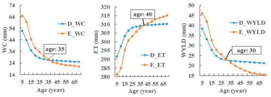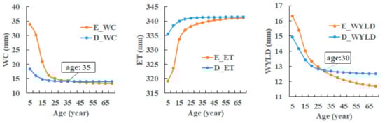 According to People’s Republic of China Forestry Industry Standard and change pattern of curve in Figure 7 and Figure 8, we take trees younger than 40 as a young forest, and those older than 40 as a middle-aged forest and statistically analyze the hydrological effects of forest age and tree species changes on different spatial scale.