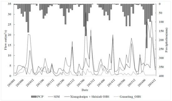where and are the observed and simulated values, respectively; and and are the average of the observed and simulated values, respectively. R2 describes the degree of deviation between the simulation results of the model and the measured results. Its value is between 0 and 1 and a larger value indicates better simulation; it is generally believed that a value of approximately 0.5 means an acceptable simulation result [36]. For the simulation of monthly step size, when 0.75 < NSE ≤ 1, the fitting effect is very good; when 0.65 < NSE ≤ 0.75, the fitting effect is good; when 0.50 < NSE ≤ 0.65, the fitting effect is satisfactory; and when 0.50 ≤ NSE, the fitting is not acceptable [37].