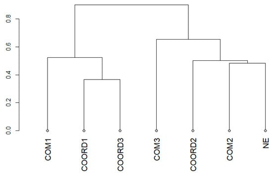 In order to group the identified variables, a hierarchical clustering analysis was performed. The grouping method was chosen using the Ward method, which creates groups minimizing intra-group variance, and a complement to one of the Pearson correlation value was chosen as the measure of distance [100]. The results of the analysis are presented in Figure 1. It can be noticed that there is a clear separation of two groups of variables: COM1, COORD1, and COORD3 as well as COORD2, COM2, and NE, with the variable COM3 being the link between them.