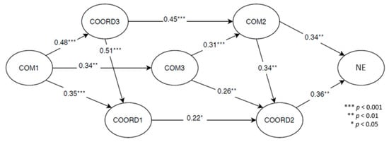 Model of sequential relationships between inter-organizational communication, coordination, and network effectiveness. 69 was obtained and for the second one Bayesian Information Criterion (BIC) = −11.98. A clearly inferior BIC value for the first model indicates its better predictive capability.