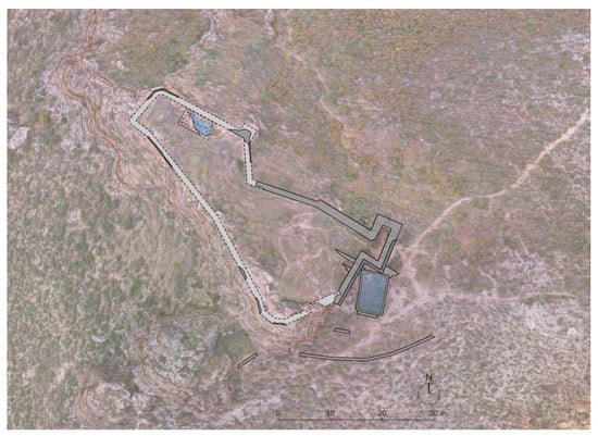 29]. The preserved remains correspond to the base of the conduction, forming a somewhat straight path. Before reaching the cited hill, a trapezoidal-shaped facility built with masonry is located, measuring 0.57 m on the north side, 0.55 m on the west side and 0.51 m on the south side, although in the east, there is no built wall; instead, the natural rock stands out of the ground. This facility could be a pen built at the same time as the conduction, given that the wall of the facility and the conduction are joined on its septentrional side.