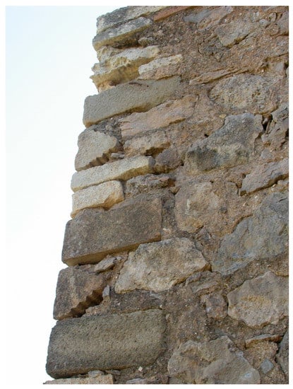 36]. Among the Catholic works using these burial elements, the church of San Cristóbal, in the old neighbourhood of Albaicín, is a notable example. Within the military works, we can highlight the stone blocks, originally tombstone borders, used as reinforcement of the wall ranging from the Gate of the Justice to the Royal Gate in the Alhambra. One of the most significant details of Mondújar Castle, making it a unique piece, is that it is the only documented place where the use of several stepped
