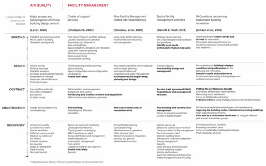 Figure 2. Services and categories of facilities management (FM) approach and delivering indoor air quality (IAQ) compared and redistributed according to the phases of the linear model of the construction process.