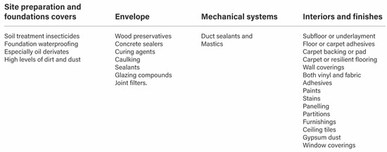 In addition to pollutants from the external environment, construction materials and materials used for interior design and furnishing, the so-called subsidiary means used for construction, also have an impact. Dealing with the issues of the construction and subsidiary materials, Burroughs and Hansen [22] identified building materials of particular concern divided in accordance with the construction phase (see Figure 3).