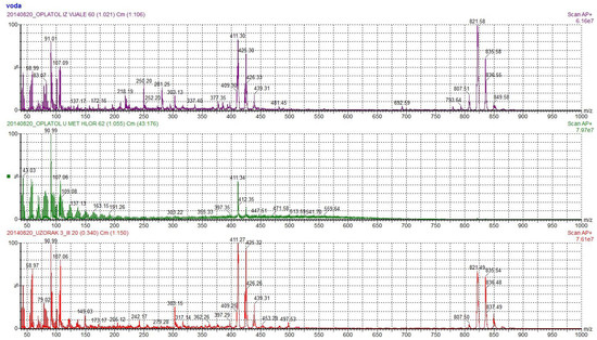 Mass spectrum of tested oil oplatol in water-up, in methanol-middle and mass spectrum of concrete-down sample. Source: [66].
