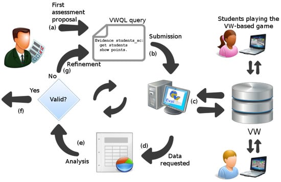 - Submission: the assessment proposal is coded in a Virtual World Query Language (VWQL) query. A VWQL query specifies a requests of concrete information from the VW interaction logs. After being coded, the query must be submitted to EvalSim, the system that interprets VWQL querys [].