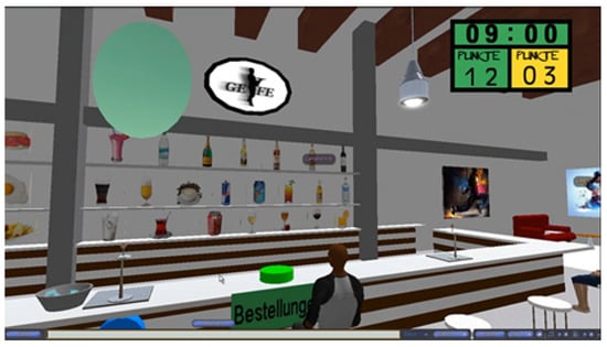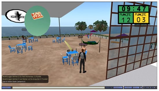 For the current study, a tailor-made competitive two player VW-based game called GEFE (German Expert and Fast waitEr), designed in line with specific learning needs and curricular requirements for CEFR A1-level German language learners, was used. Since some of the key items of students’ language curriculum are the learning of basic vocabulary and structures that are for instance needed to perform daily tasks in the target language (e.g., ordering in a restaurant or cafeteria, buying in a supermarket, etc.), the focus here was on providing students with the opportunity to practice those items by means of a competitive role-play game. The game recreates an outdoor cafeteria scenario, using simple artificial intelligence algorithms to randomly place a total number of 12 virtual client bots all over the playing field. Additionally, the algorithm assigns to each player one waiter avatar. Play starts with the two waiter avatars lined up along the counter. Each waiter avatar will receive a call for service from one of the client bots. To attend a client, the waiter avatar must first approach the table of the respective client bot and then ask him/her for the items he/she wants to order. Interaction between both the waiter avatar and client bot takes place via text chat and in the target language. Once the order has been taken, the waiter avatar must go back to the counter and prepare the order (each order consists of 3 items: a beverage, a dish and a dessert) by identifying and clicking on the image of the different items. Hereafter the waiter avatar must return to the client’s table and deliver the order (Figure 2 and Figure 3).