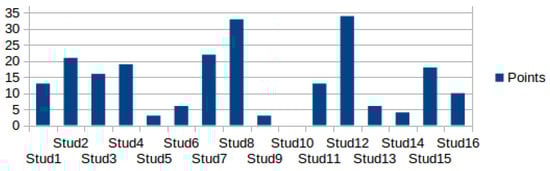 Figure 4. Student game scores (points). - Analysis: regarding the assessment proposal, the data illustrate on the one hand, that two students (Stud8 and Stud12) performed significantly better than the rest of the participating students (Stud8 obtained 32 and Stud12 obtained 33 points, while the rest of students obtained 22 or less points). And on the other hand, that six (37.5%) of the participating students (Stud5, Stud6, Stud9, Stud10, Stud13, Stud14) only obtained 6 or less points, which means a score that was five times lower than the score obtained by Stud8 and Stud12.