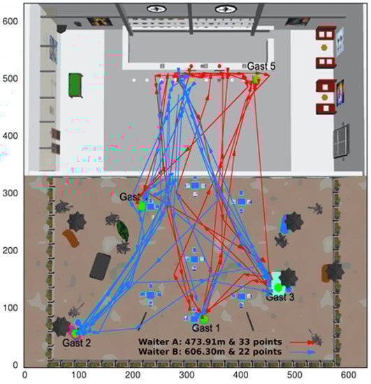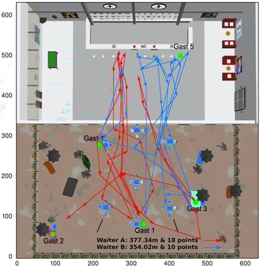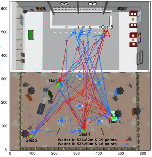 Figure 7. VW tracking map for Stud15 and Stud16. - Analysis: a look at the different VW tracking maps (Figure 5, Figure 6 and Figure 7) reveals that not all students were required to cover the same distance in order to attend to their clients. This implies that some students must make more of an effort to complete the same game task than others. Additionally, in terms of assessment, it means that conventional performance assessment criteria such as game score alone are clearly insufficient.For instance, the data in Figure 5 which show the interaction and distance covered by Stud4 (Waiter A) and Stud3 (Waiter B) clearly indicates that both students faced a similar challenge in terms of distance and hence effort required to deliver their clients’ orders. In this case, the student who performed best (Stud4), having a higher game score showed clearly a better knowledge of the target language compared to the one who performed worse (Stud3). Nonetheless, a look at Figure 6 illustrates that in the game session played by Stud7 and Stud8, Stud8 (Waiter B) needed to cover a much longer distance (146.08 metres and thus 30 per cent longer) compared to Stud7 (Waiter A) in order to attend two clients less. In fact, while Stud 7 (Waiter A) attended 11 clients, Stud8 (Waiter B) attended only 9 clients. Hence, considering game score alone would not be fair to assess students’ performance.A third case is finally illustrated in Figure 7. The data from Figure 7 show that Stud15 (Waiter A) attended, in the same amount of time, one more client than Stud16 (Waiter B) hence being more efficient. Regardless of the fact that Stud15 (Waiter A) needed to cover a greater distance and thus make a greater effort, he/she was able to attend much better to his/her clients’ orders than Stud 16 (Waiter B). A look at students’ game scores confirms the authors’ assumption, clearly indicating that Stud15 has a stronger knowledge of the target language compared to Stud16: while Stud15 (WaiterA) obtained 18 points (a ratio of 100% regarding the delivered items), Stud16 (WaiterB) obtained only 10 points (resulting from an average ratio of 66%).After analysing the different VW-tracking maps, we tried to identify a general group behaviour based on the data normalisation (Figure 8). While the blue line indicates the normalised clients (i.e., the clients attended by the students divided into the maximum number of clients attended by a student in the group), the red line indicates the normalised distance (i.e., the metres run by the students divided by the maximum metres run by a student in the group). Students are sorted according to the normalised clients.