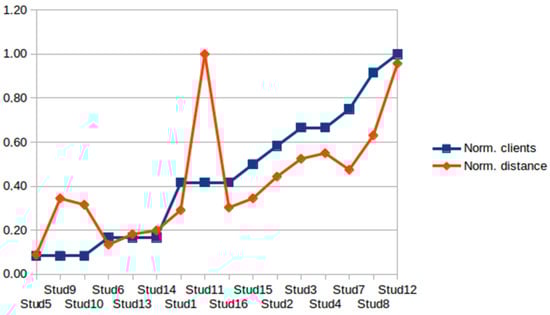 Figure 8. General group behaviour. - Validated: from the teacher’s point of view, the indicator for the number of clients attended complements the previous indicator (distance covered) when assessing students’ interaction in the target language, since both indicators highlight the effort students had to make in order to accomplish the given task. Moreover, the data from Figure 8 show the more clients a student attended, the greater the amount of effort he/she was required to deliver (i.e., distance covered). In this context, it stands out that Stud6, Stud13 and Stud14 respectively covered 0.13, 0.18 and 0.20 metres (out of a normalised maximum of It 1.0) in order to attend the same normalised number of clients (0.17). The same applies to Stud3 and Stud4, who both attended the same normalised number of clients (0.67), covering 0.52 and 0.54 metres respectively (out of a normalised maximum of It 1.0).Nonetheless, there are several exceptions: the most outstanding case is Stud11, who covered the longest distance (1.0) while attending a below-average normalised number of clients (0.41). A similar difference can be observed in the case of Stud9 and Stud10. Therefore, the question of what might have caused the difference between the distance covered by each student and the number of orders (clients) attended is raised. A look at the previous indicators explains the differences: on the one hand, both Stud9 and Stud10 only attended 1 client (see Table 2), after having played the game for 3-min (see Table 3), so their interaction was not long enough to be taken into account. On the other hand, Stud11 showed a significant interaction with the VW, while his/her performance was average: he/she attended 5 orders in the same time his/her game-partner (Stud12) was able to attend 12 orders, so he/she probably needed to approach his/her clients several times to make sure that his/her orders were delivered correctly.
