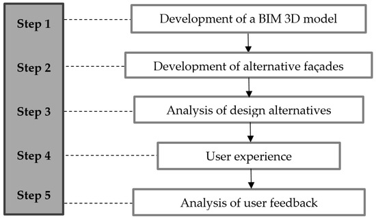 The experimental process’s primary goal is to analyze the changes in performance, embodied energy, and costs concerning decision-making on alternative façades. The study, therefore, includes the development of different design alternatives and then the undertaking of a user survey to understand user perception of the changes made in terms of costs and carbon emission ranges. Figure 1 demonstrates the entire research process in five steps. Each step is briefly described below.