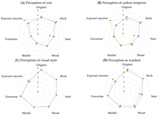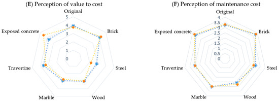 Figure 3A presents the mean results of participants’ feedback over the ‘cost’ category. Blue lines represent the participants’ opinion of the façade cost before they had access to the assessment results by looking at the 360-degree images. The orange lines, however, represent their opinion after having access to the assessment results. This chart’s high score represents a façade with a low cost, whereas the lowest score belongs to an expensive façade. Steel and exposed concrete had a major change between, before, and after access to the assessment results. The score for steel cost drops from 2.70 to 1.85 after the participants got access to the data showing steel as an expensive option. The exposed concrete score increases from 3.56 to 4.62 being promoted as an economical option. The difference in scores between the original façade and the wooden façade is evident; the original façade has a score of 0.67 higher than the wooden façade before access to the experimental data and still has a score of 0.58 higher after the information is provided.