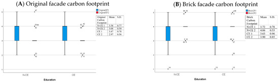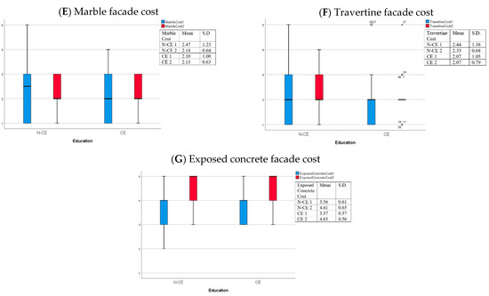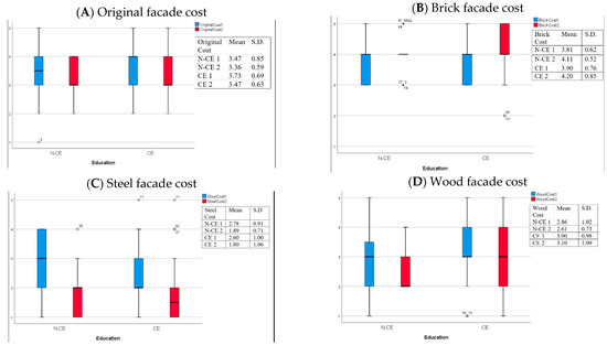 The box plots for the façade cost reveals how N-CE answered differently than the CE. It gives an idea of how much each group gets influenced by the assessment results. The mean and standard deviation for each data set are presented on each box plot’s right side. The standard deviation determines the variation in answers within their relevant group (N-CE or CE). The boxplots show the line for medians and some outliners, meaning that the ranges of answers from minimum to maximum are all within the median rank on the Likert scale. The answers that are different from the median value are treated as outliners.