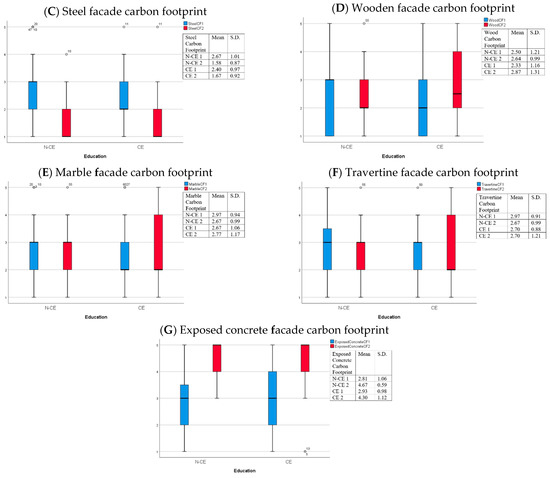 Figure 3B illustrates the mean results of participants’ feedback about the ‘carbon footprint’ category of the different façade alternatives. Steel and exposed concrete are the two materials with a significant change of scores before and after access to assessment results. Steel drops from a mean score of 2.55 to 1.62 after the information is exposed as the highest carbon footprint material. The mean score for exposed concrete increased from 2.86 to 4.50, which is considered to be the highest mean score across different materials despite having a carbon footprint close to travertine, marble, wood, and brick.