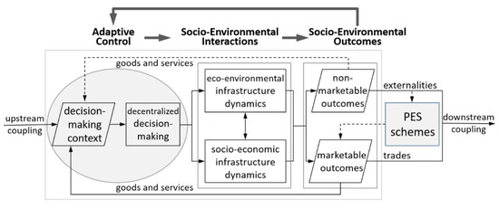 We presented an agent-based coupled infrastructure system (CIS) framework for assessing PES sustainability (Figure 1). The framework highlights three points. Due to non-marketable goods/services produced by a focal CIS and maintaining the optimal provision, ES as positive externalities has given rise to dedicated market-like arrangements. PES schemes should have environmental externalities of human actions internalized. The externalities often lead to a market failure, and stakeholders will incline to under-provide ES [2]. Incentive-based policies take externalities through the changes of economic incentive and management practices. The CIS’s upstream coupling affects decision-making and transfers goods and services via PES schemes to downstream coupling stakeholders. The framework was extended based on the “optimal control” conceptualization of socio-environmental systems (i.e., CIS) by Anderies (2015), through highlighting three points: (1) PES schemes as a marketization means to internalize the externalities due to the non-marketable good/services generated by a focal CIS; (2) decentralized decision-making of the ES suppliers in the focal CIS, concerning production allocation of eco-environmental infrastructures and socio-economic infrastructures as well as to the consumption of marketable and non-marketable goods/services; and (3) the focal CIS’s downstream coupling affecting the ES beneficiaries as well as its upstream coupling that affects the ES providers’ decision-making. This recognition of spillovers’ importance suggests that we need to move from SESs to coupled infrastructure systems (CISs).
