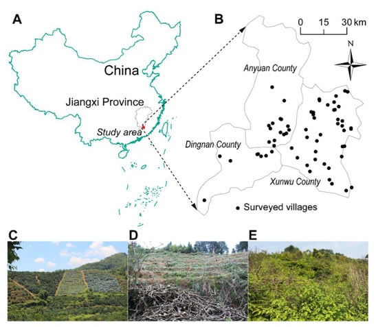 Overview of the Converting-Orchard-to-Forest (COF) project. (A) Location of the study area—Dongjiang Headwater Watershed (DHW). (B) Spatial distribution of villages in Xunwu County, Dingnan County, and Anyuan County. (C) Landscape before COF. (D) Landscape during COF. (E) Landscape after COF. Points are rural villages’ spatial location.