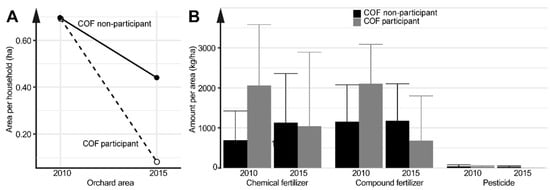 Due to COF implementation, participant households’ orchard area decreased sharply from 0.694 ha to 0.085 ha in the two periods (Figure 3A). Both the participant and nonparticipants have reduced their orchard area at different levels. This indicated that participants had reduced their income because their orchard trees have been cut down following the government’s policy. While nonparticipant households’ orchard area has decreased slightly from 0.695 ha to 0.442 ha, their income will not dramatically change (Figure 3A). As for the chemical fertilizer and compound fertilizer amounts between participants and nonparticipants used, participants’ chemical fertilizer in 2010 and 2015 decreased from 2053.320 to 1038.520 kg/ha while nonparticipant’s chemical fertilizer increased from 682.840 to 1121.010 kg/ha. The participants’ amount of chemical fertilizer and compound fertilizer amounts in 2010 was larger than that of nonparticipants while the amount was smaller than the nonparticipants in 2015. Meanwhile, the participants’ compound fertilizer decreased from 2098.630 kg/ha to 678.030 kg/ha, and nonparticipants’ compound fertilizer increased slightly from 1145.390 to 1170.870 kg/ha during the two periods. In 2010, the pesticide usage amounts of participants and nonparticipants were 32.230 kg/ha and 32.292 kg/ha, respectively. In 2015, the pesticide amount of participants and nonparticipants were 3.912kg/ha and 20.513kg/ha, respectively (Figure 3B). This indicated that the participants reduced their pesticide usage amounts compared with nonparticipants and achieved the planned environmental goals, i.e., enhancing the hydraulic services and reducing fertilizer amounts.